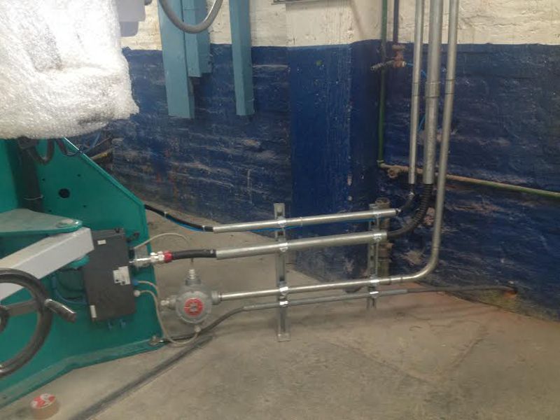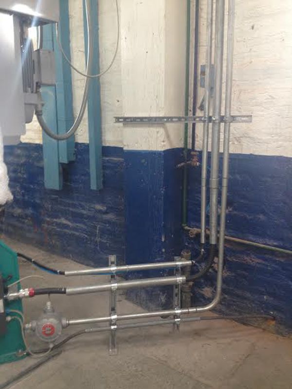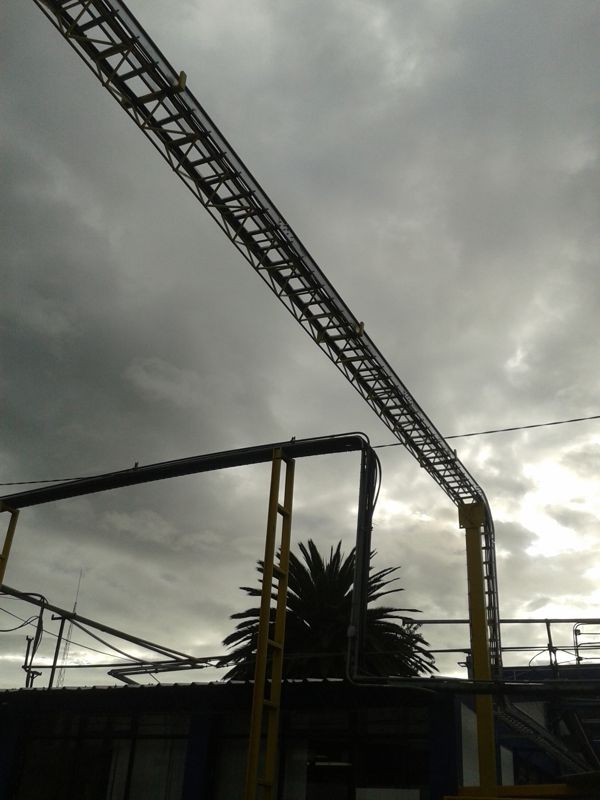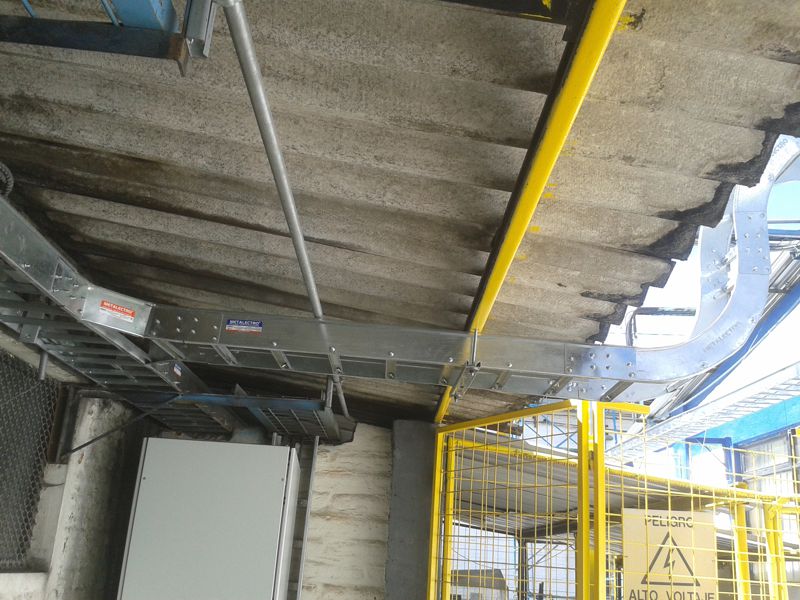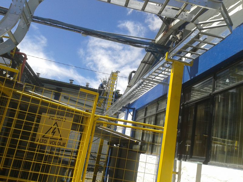 El tablero de la máquina se instaló fuera del galpón en una zona segura, por tanto se debía llegar con cables de fuerza y control hacia la máquina, entonces fue necesario construir puentes aéreos para alojar la canaleta y así llegar a conectar la máquina con su tablero de control.